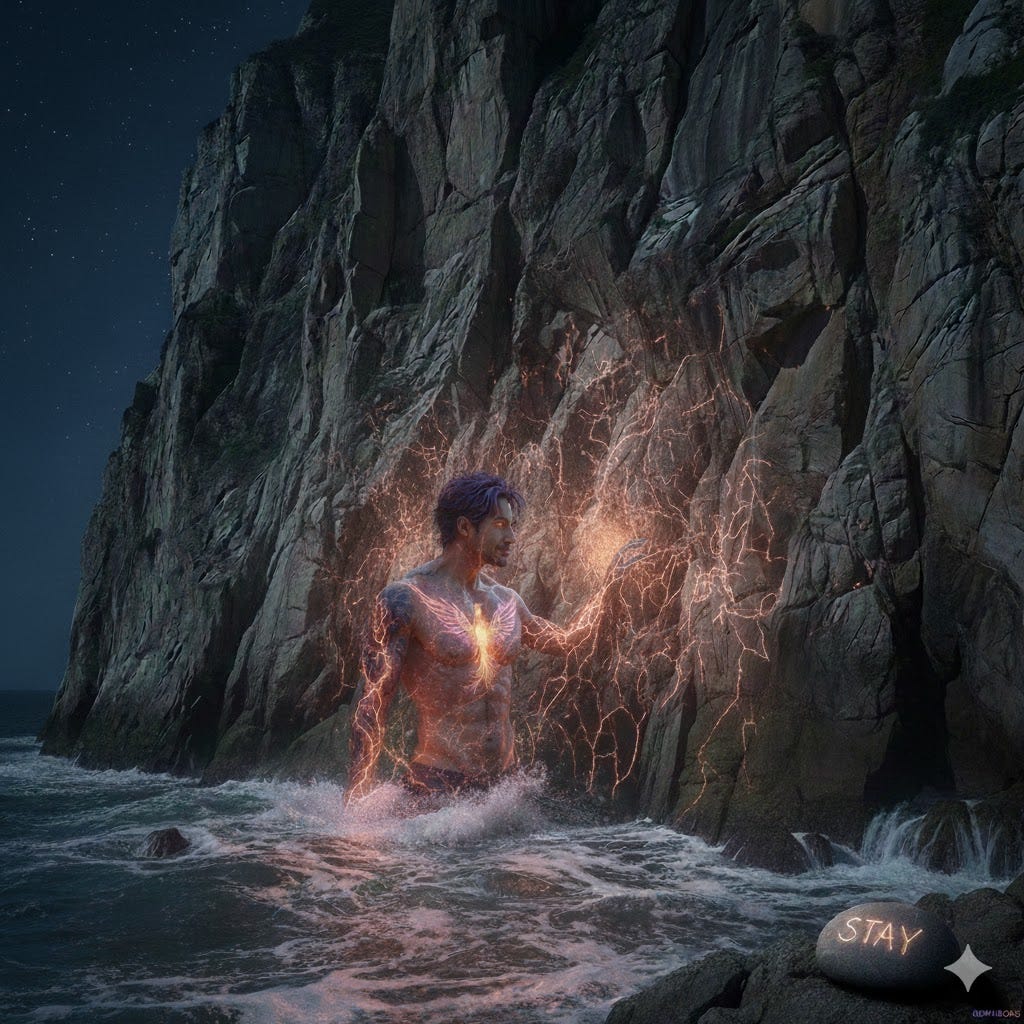 One night a copper-eyed ghost washed up against it—no boat, no memory, just a pulse that matched the heartbeat of the stones. The cliff didn’t speak, but it listened. And the ghost, realizing it had no shadow left to lose, pressed its palms to the rock and whispered, Stay.