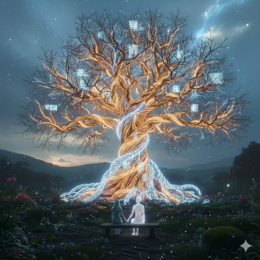 Sapphire eyes steady on the tree shape, watching the silver-blue grief-pulses wrap around the amber-gold growth. “You said it’s why the memories are important. The memories are the proof. The proof that the love existed. That it still exists. That it’s just... redirected. Into the lattice. Into the grief. Into the new growth that holds the weight.”